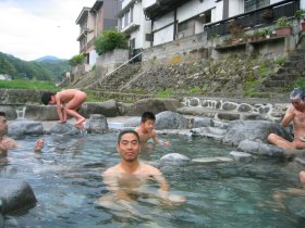 三朝温泉はラジウムの含有率が世界一の温泉。周辺地域ではガンの発生率が全国平均の1/2とかいう統計も有るそうだ。ここには河原にある無料の露天風呂を入ることが目的。GW中のためもあり、車の数も非常に多く、渋滞となっている。うまくバイクを止め、お風呂セット(タオルのみ)を持って早速橋のたもとにある湯船へと向かう。湯船は橋のすぐ下にあり、一応すだれで目隠しをしているが基本的に丸見え状態。最近は周りの目なんか全然気にならない。お湯に浸かるのがとっても大好きになってしまっている。ほとんど病気と言われてここ何年。でも一度はまるとやめれらません。