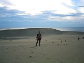 砂丘の一番上は特に風が強く砂粒がとても痛い。海岸べりまで降りて、あとで相棒に日本海の経験を積ませてあげるために日本海の水を汲む。ここから砂丘を登り返すが、♪三歩すすんでにほ二歩さがる の様な感じでハァハァ言いながらやっと砂丘を登り返す。