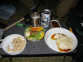でもぼくらも負けずに、990円のテーブル二つをL字型に並べ、携帯椅子にのんびりと腰掛け、ビール片手にキャンプを満喫。