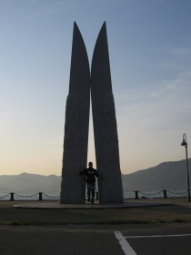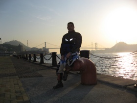 フェリーを下りてまず向かうは関門海峡。朝のヒンヤリした空気がとても気持ちよい。ちょうど朝日が昇ってくる所だったので、まさに旅の始まりとしてぴったり。