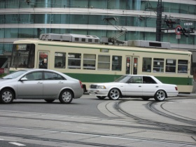 特に右折するときに対向車が来ている時の待機場所とかね。確か教習場では路面電車との共存については教わった様な気もするけど、既に二十年以上前のことだし完全に忘れてます。それからいつも思うけど、雨降ったときはコーナーで滑りそうだなって感じ。そういう意味ではライダーの敵って所かな。