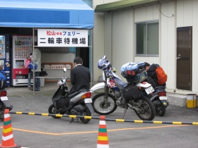 日も沈み辺りも暗くなってきてようやく松山港に到着です。天気は今にも雨が降り出しそうないやな感じ。