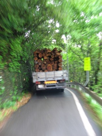 少しまったりしてから四万十を河口に向けて走り始めます。途中、木材を運んでいる大型トラックの後に付いたんだけど、これがまたすごいんだ。