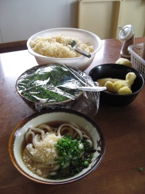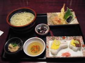 ちぃにぃは少し早いけど、お昼ご飯もかねてということで、釜ぶっかけ+天ぷら+押し寿司のセット(名前は忘れた)を頼みます。