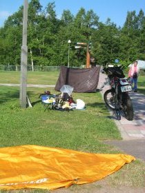 5:30起床。夜露でフライが濡れていたので、芝生に広げて天日干し。