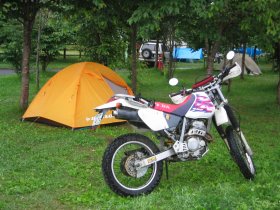 キャンプ場を見渡して見ると、オフ車が多いのとみんなバイクをブルーシートの下に
