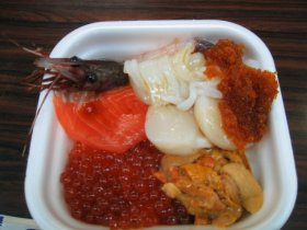とりあえず、市場内を一周してみて、それから食事です。「勝手丼」にはウニ・イクラ・ホタテ・ボタンエビ・イカ・キングサーモン・トビコ(おまけ)をのせて¥1850でした。十分お腹いっぱいになりました。