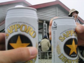 山小屋の受付は大渋滞。受付をするのにも行列待ち。ビールも残り少なくなってきたが何とか確保。山の上のビールは最高。