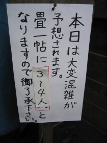 小屋の前には「今日は畳一帖に3−4人]との案内が・・・周りの人達の話を聞くと夕食も全部で7回戦で、最終組は夜の9時40分から開始だとさ。