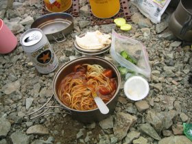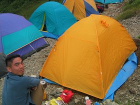 五竜山荘のテント場に到着した時は既に一杯。それでも何とかテントを張れる場所を探して設営。でもつぎから次へと登山者が現れテントを張れる場所を探している。我が家はとりあえず落ち着いたのでビールで乾杯をするために小屋に行く。