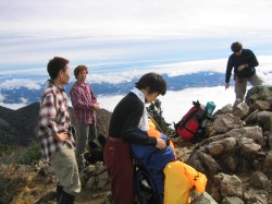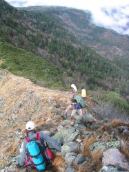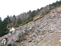 小屋を後にして山頂を目指してのぼり始める。最初は樹林帯だが途中から大きな石がゴロゴロしているガレ場になる。昨日山頂に登った組が「昨日は一体何で登ったんだろう」とぼやいているので、リーダと私は「へへへ。こうなることは解っていたんだもんね。」と嘯きながら登る続ける。