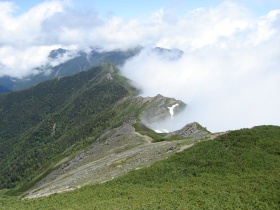 次は雨に降られなかったことだな。この梅雨のまっただ中に一度も雨に打たれることなく、しかも肩の小屋では周辺の山々達も見ることができたこと。