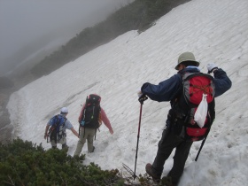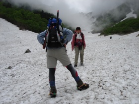 ↓雪渓を慎重に下ります。アイゼンもピッケルもなしでね