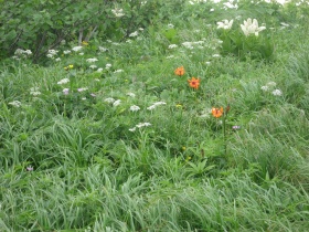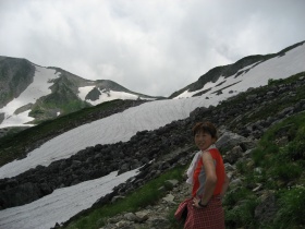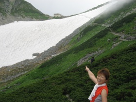 ここからは御前小舎までダラダラ登りながらの道を歩くだけ。朝雪渓を越えるときは雪も堅かった事もあったけど、強い日差しと気温の高さから雪もだいぶん緩み、人もかなり歩いていたので足下を気にせずに歩くことができました。朝はガスで見えなかったけど、ガスが晴れて見えた雪渓の大きさにはちょっとびっくり。今年は場所に因っては残雪が非常に多いんだね。