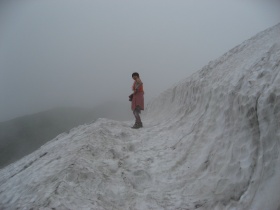 上右の写真は雪渓の途中の写真です。ガスが出ても大丈夫な様に、ルートに小さな石が置いてあります。恐らく小屋の人たちが置いてくれたんでしょうね。お疲れ様です