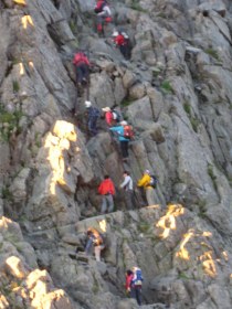 小屋周辺では暗い打ちから山頂で日の出を迎えようとする人たちなのか、続々と奥穂へ向かう壁に取り付いている。