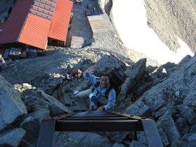 最初から岩とハシゴが連続する登り。西側から非常に冷たい風がビュービュー吹いていて、寒い寒い。まだ日差しもないので尚更寒いんだな。