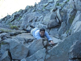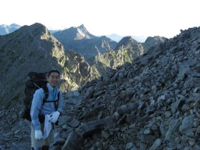 で、最後の前穂も他の穂高と名の付く山頂と同じようになかなか手強いんだよね。基本的には岩登りの連続だし、浮き石なども沢山あり落石するもされるも危険な所。
