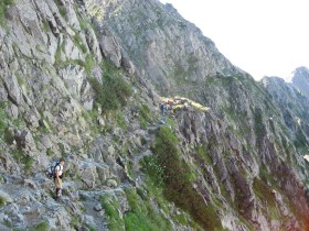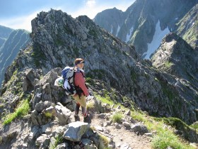 岳沢へと切れ落ちる谷と稜線をトラバースする登山道と時々ある岩場の下りと、結構バリエーションに富んでいるし、高度感もあるし、危険だし。
