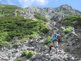 ちょうどヒュッテとの中間点あたりで数組の登山者とすれ違ったけど、斜度と暑さでバテバテみたい。皆テント装備ではないので、岳沢ヒュッテには宿泊できないから上高地から登ってきたんだろうね。