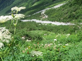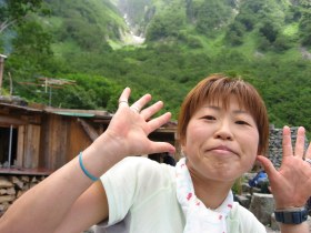 でも、沢沿いのお花畑の花たちに心和まされながら、岳沢ヒュッテに到着。
