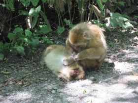ここからは梓川沿いをのんびり散策モード。観光客と一緒に歩きます。途中猿たちがのんきにノミ取りなどをしながら家族団らん中。