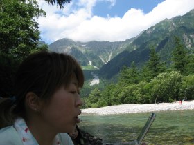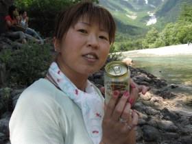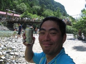 河童橋周辺になり、さすがに人が多くなってきたと思ったら橋に到着。ザックを降ろして、梓川のほとりに出てBeerをいただきます。
