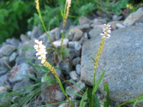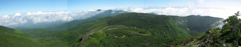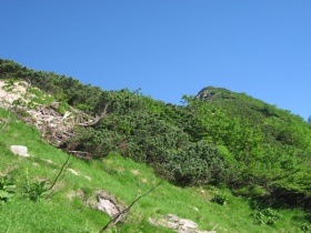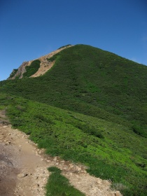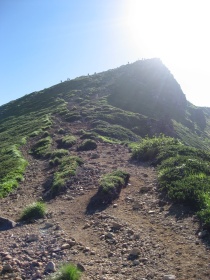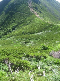 で、ここは冬に来たときは山頂直下から尻セードをした場所なんだけど、今はハイマツで覆われているのでその面影はありません。