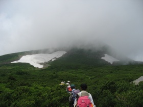 ←前方の雪渓が見えてきました。